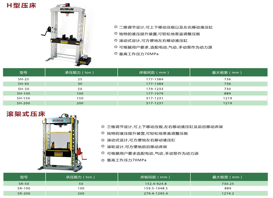 RVMUN SR-200系列200T滾架式液壓壓床技術特點: